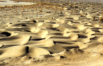 我们横穿克里雅河与和田河两河之间的沙漠,在中心部位我们整整走了7天(四十余公里),穿行在流动沙丘之间,体验了“死亡之海”中心的严酷环境,亲眼看到了这里风沙地貌的真面目。沙丘此起彼伏,连绵不绝。在这里风是艺术大师,它就地起沙,造就了多种形态的沙丘及其类型组合。不同风向、风动力流的作用,在沙丘上形成不同图案的沙波纹,实在令人惊讶不已。我们顶着烈日在这茫茫的流动沙丘中穿行的时候,常常看到局部气流的扰动引起的龙卷风。它卷起万丈沙柱,腾冲蓝天,滚动前进。在这景色单调寂静的沙海里,龙卷风着实令人心惊。一旦遇上沙漠风暴,那肆虐的风的威力远远要超过我们的想像力。狂风大作,沙尘腾起,于是天昏地暗,原来的沙丘随风吹扬,随时都在改变形态。一切沙丘都好像是活了起来、生动起来,就如大海的波涛那样沸腾起来,汹涌澎湃。风停之后,沙丘又变成了凝固的波涛。由于一个地区常年总有一种主要风向,于是按照主要风向,一个个沙丘又作有规律的排列,因此这凝固的沙海波涛也是有规律可循的。我们看到,这里大漠深处大部是复合新月形沙丘链构成的鱼鳞状沙丘组合类型。