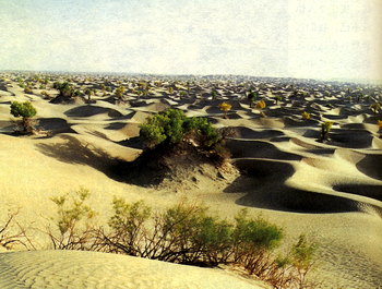 在我们这次横穿两河之间的中央地带时,发现这里的裸露流动沙丘,全部一致作北北东方向有规律的排列和组合,比较紧密,没有丘间洼地。这就说明北北东方向风力的作用,塑造了这里独特的沙岭、沙谷地貌,它们是流动沙丘。局部还出现不少高大的星状沙丘,表明金字塔形沙丘的形成是十分复杂的。它不单纯是几种不同风向的共同塑造的结晶,恐怕还与古地形、局部气流的扰动复合、近地面逆温层等原因有关。此外,这里没有丘间洼地,也末发现任何古河道的遗迹;这里没有植物,只有流动沙丘带的边缘才出现一些塔克拉玛干怪柳,作稀疏分布。由于没有丘间洼地,疏密度等于零。这里环境条件十分恶劣,我们途中亲眼见到飞鸟落在沙丘中干热而死的情景,是真正的“进得去,出不来”。从古到今,克里雅河与和田河两河之间没有在这里交互作用复合过。它们都是独立的水系,近似于平行的水系。没有受过古水系作用的中央地带,当然不会存在大型丘间洼地了。事实表明,塔里木盆地中形成沙漠的风力作用应该是以和田河作为分界比较适宜,也由于两河间主要受北北东方向风力吹扬的流动沙丘,其前进方向直指和田绿洲,因此采用工程措施和生物措施防止沙漠扩展和侵袭,是保护和田绿洲时必须要考虑的。