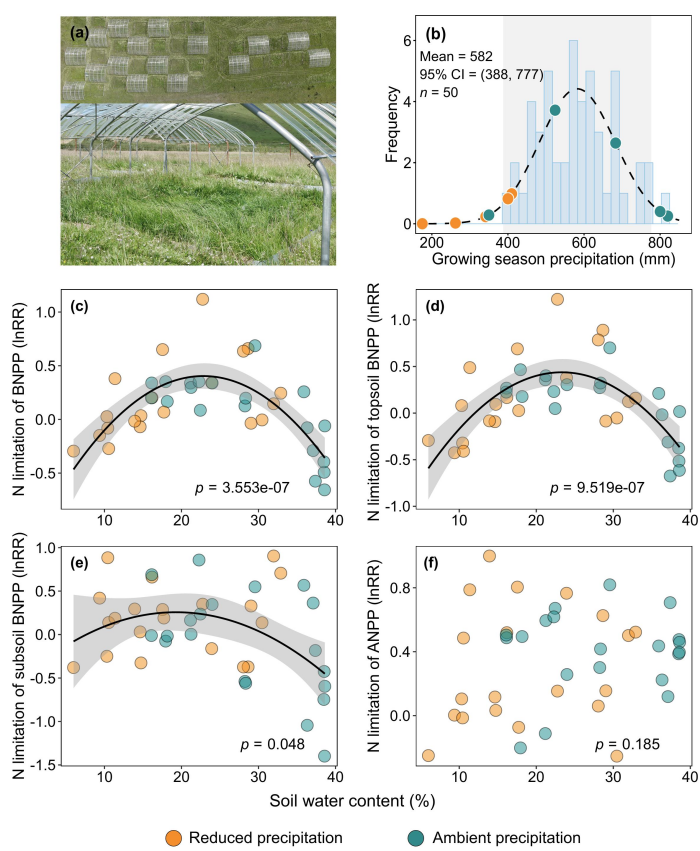 图 2. | 土壤含水量(SWC)与地下(BNPP)和地上(ANPP)生产力氮限制之间的关系,基于长期高寒草地控制实验。(a) 实验样地概貌。(b) 研究区生长季降水量的近 50 年频率分布。绿色点为自然降水,橙色点为减雨 50%。图(c)、(d)、(e) 分别为 SWC 与总 BNPP、表层 BNPP 和深层 BNPP 氮限制之间的关系,图 (f) 为 SWC 与 ANPP 氮限制之间的关系。