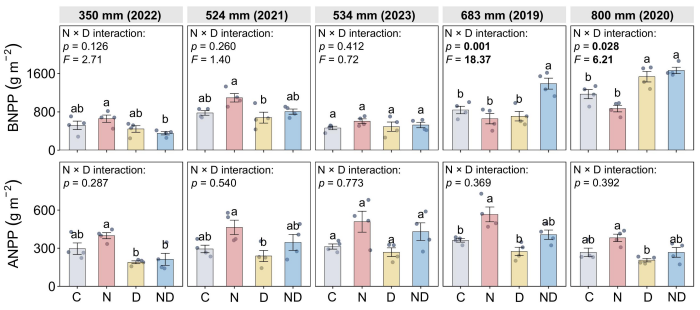 图 3.| 高寒草地多因子控制实验不同处理的地下(BNPP)和地上生产力(ANPP)。C,空白对照;N,氮添加处理;D,干旱处理;ND,氮添加与干旱的组合处理。不同字母表示处理间存在显著差异。
