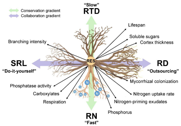 阐明植物性状间的共变关系,是理解物种资源获取策略、多样性维持机制及生态系统对环境变化响应的重要基础。受地上“叶经济谱”理论的启发,根系生态学家构建了全球尺度的“根经济空间”(Root Economics Space, RES)理论框架(Bergmann et al. 2020, Science Advances),试图通过“快–慢”权衡的保守梯度(Conservation gradient; 由根氮RN与根组织密度RTD定义)和“自给自足–外包协作”的合作梯度(Collaboration gradient; 由比根长SRL与根直径RD定义)来统一描述植物地下资源获取策略(图1)。由于涉及的核心性状数量少,且易量化,RES很快成为根系生态学、植物功能生态学以及生态系统生态学研究的重要理论框架。但随着全球研究不断积累,越来越多实证研究发现:RES在不同植物群落或生态系统中的表现并不一致,其主轴结构和关键性状组合常发生偏移甚至“瓦解”,表明现有RES框架尚不足以全面准确概括植物地下资源获取策略,其普适性也因此面临挑战。