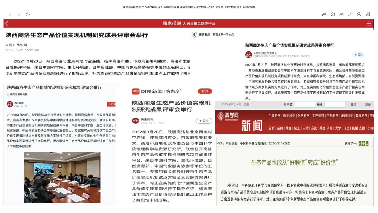 多家媒体聚焦此项联合攻关成果。人民日报社民生周刊以《陕西商洛生态产品价值实现机制研究成果评审会举行》为题对此项成果进行了报道,科学网、学习强国、腾讯新闻、网易新闻等多家媒体先后以《陕西商洛生态产品价值实现机制研究成果评审会举行》、《生态产品也能从“好颜值”转成“好价值”》为题进行了转载。