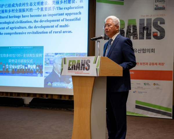 韩国农渔村遗产学会会长致开幕辞,济州特别自治道知事Oh yonghun致欢迎辞,韩国农林畜产食品部、海洋水产部代表分别致贺辞。联合国粮农组织(FAO)全球重要农业文化遗产(Globally Important Agricultural Heritage Systems,GIAHS)高级协调员Jeremie Mbairamadji概述了全球重要农业文化遗产在成就、挑战与未来展望方面的全球进展,强调需加强区域平衡与合作;ERAHS名誉主席Takeuchi Kazuhiko教授阐述了农业文化遗产在全球环境治理中的多重价值,突出其在应对气候变化和促进人地和谐方面的作用;ERAHS共同主席,中国科学院地理资源所研究员闵庆文总结了中国GIAHS保护20年的成就与问题,并提出完善管理、深化国际合作等对策;ERASH执行主席Yoon Wonkeun教授分析了韩国自2010年以来农业遗产政策的演变与挑战,强调其在经济、生态和社会层面的综合效益及需优化治理与参与机制。