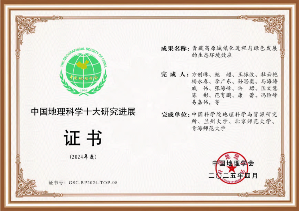 由方创琳研究员牵头,鲍超、王振波、杜云艳、杨永春、李广东、孙思奥、马海涛、戚伟、张海峰、许珺、匡文慧、陈彬、范育鹏、康蕾、冯险峰、易嘉伟等共同合作完成的“青藏高原城镇化进程与绿色发展的生态环境效应”成果获得2024年度中国地理科学十大研究进展。本成果在科技部第二次青藏高原综合科学考察项目和中国科学院先导专项课题资助下,系统解析了青藏高原城镇化的特殊性与时空演变分异规律,定量测度了青藏高原城镇化对生态环境的影响,采用多模型算法计算了基于资源与生态环境约束的青藏高原城镇化承载阈值约2620万人,提出了捍卫国家安全屏障的青藏高原“梳状”固边型城镇体系建设方案,为协调地球第三极城镇化与生态环境关系、保护亚洲水塔及绿色发展提供了重要科技支撑。出版《青藏高原城镇化绿色发展地图集》(中国地图出版社,2024)、《青藏高原城镇化进程与绿色发展》(科学出版社,2024)、《青藏高原城镇化及生态环境效应》(科学出版社,2023)、《青藏高原人类活动的数字足迹及挖掘》(科学出版社、2023)等专著。《青藏高原城镇化绿色发展地图集及电子地图系统》获2025年度国际绿色设计十佳作品奖。相关报道链接:https://www.gsc.org.cn/gsc/xueshuDetail.html?id=58&contentId=2034。