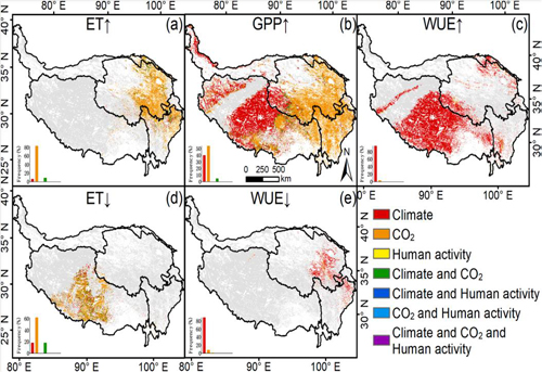 青藏高原ET、GPP和WUE变化趋势(p<0.05, ↑ 和↓ 分别表示上升和下降)的驱动因子的分布格局图